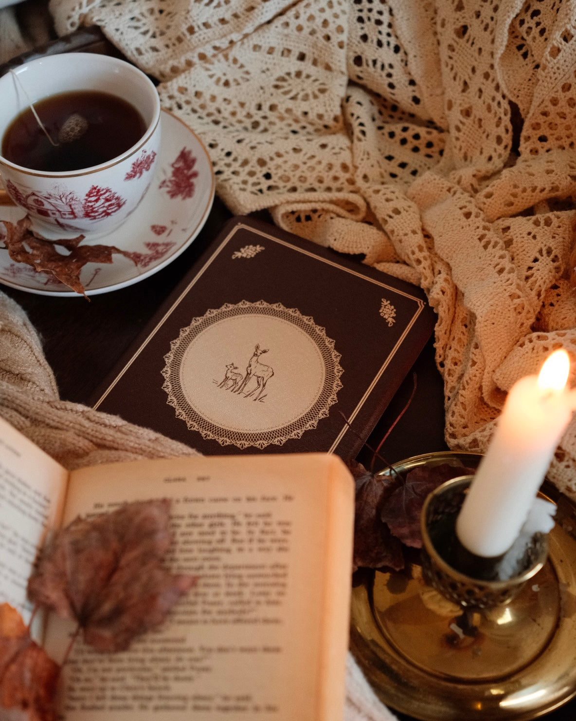 a rich chocolate brown case with a delicate doily-inspired frame (plucked straight from the tolerate it table) and two quiet deer at the center. soft, warm, and sentimental.